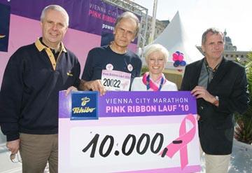 Wien, 17.04.2010 - 1.500 LäuferInnen drehten am Vortag des Vienna City Marathons ihre 2,5 km lange Runde um den Ring und stellten sich somit in den Dienst der guten Sache. Der 2. Pink Ribbon Lauf, der durch die großartige Unterstützung von Tchibo und dem Vienna City Marathon möglich wurde, brachte der Österreichischen Krebshilfe Euro 10.000 für den Pink Ribbon Soforthilfefonds für Brustkrebspatientinnen.