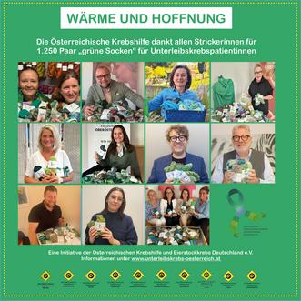 »Grüne-Socken-Stricker:innen« werden herzlich eingeladen, den Facebook und Instagram-Profilen »Grüne Socken Österreich« und dem YouTube-Kanal „knitandshine“ zu folgen. Alle Informationen zur Aktion unter www.unterleibskrebs-oesterreich.at.