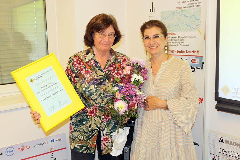 Im Jänner 1993 stieß sie als ehrenamtliches Vorstandsmitglied der Krebshilfe Steiermark zu uns - jetzt nahm Dr. med. Isle Hellemann-Geschwinder (li.) Abschied aus dem Vorstand. Jedoch nicht ohne eine Laudatio unserer Präsidentin Univ.-Prof. Dr. Florentia Peintinger, einen symbolischen Dank in Form eines Blumenstraußes und einer Urkunde, die sie ab sofort als Ehrenmtiglied der Krebshilfe Steirmark ausweist. Ad multos annos - und DANKE!