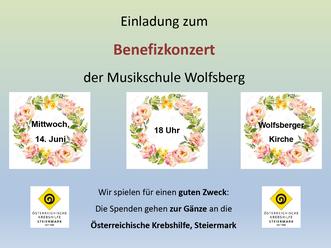 Einladung zum Benefizkonzert der Musikschule Pro Omnia Wolfsberg im Schwarzautal am Mittwoch, 14. Juni 2023 um 18 Uhr in der Wolfsberger Kirche. Wir freuen uns über Ihr Kommen und Ihre Eintritts-Spende.