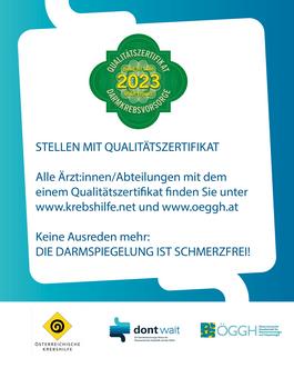 „Darmkrebs ist wie kein anderer Tumor früh zu erkennen und damit heilbar,“ so Univ.-Prof. Dr. Michael Gschwantler, Präsident der Österreichischen Gesellschaft für Gastroenterologie und Hepatologie (ÖGGH). „Noch besser ist es, die Vorstadien (Polypen) im Rahmen der Darmspiegelung - die heute schmerzfrei durchgeführt werden kann - aufzuspüren, zu entfernen und so die Entstehung von Darmkrebs zu verhindern. Um sicher zu sein, dass Sie die Vorsorgekoloskopie in entsprechender Qualität absolvieren, sollten Sie auf das „Qualitätszertifikat Darmkrebsvorsorge“ der ÖGGH achten.“ (Anmerkung: Auflistung aller Stellen unter www.krebshilfe-sbg.at und www.oeggh.at sowie in der aktuellen Broschüre)