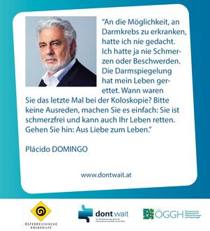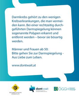 Seit 20 Jahren appellieren die Österreichische Krebshilfe und die Österreichische Gesellschaft für Gastroenterologie und Hepatologie (ÖGGH) an Österreichs Frauen und Männer, die Darmkrebsvorsorge ab 50 ernst zu nehmen. „Mit dem Slogan „Don’t wait – Warten Sie nicht“ wollen wir auch heuer wieder der Bevölkerung deutlich machen, dass es fatale Folgen haben kann, die Möglichkeit einer effektiven Darmkrebsvorsorge nicht zu nutzen,“ so Univ.-Prof. Dr. Paul Sevelda (Präsident der Krebshilfe Österreich Dachverband) und Univ.-Doz. DDr. Anton-H. Graf (Präsident der Österreichischen Krebshilfe Salzburg).