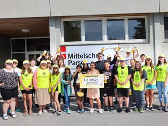 Mit einem Rekordergebnis endete kürzlich die Krebshilfe Sammlung der Mittelschule Parsch. Nach mehrjähriger Coronapause haben heuer wieder fast 30 Schülerinnen und Schüler mit gelben Sammeldosen der Krebshilfe Salzburg um eine Spende gebeten. „Wir wollten unbedingt wieder an der Sammlung teilnehmen und damit Gutes tun und unseren Teil dazu beitragen, dass die vielen Krebspatient*innen und ihre Familien durch die Krebshilfe Salzburg gut betreut werden können. Gerade für Familien und Kinder von an Krebs erkrankten Eltern ist die Unterstützung durch die Krebshilfe eine enorme Erleichterung. So war auch die Motivation bei uns nach der langen ‚Coronasammelpause‘ besonders hoch. Ein solches Sammelergebnis ist einfach spitze“, freuen sich Lehrerin und Sammlungsorganisatorin Irene Ebner und Direktor Andreas Hetzenauer mit den Schüler:innen bei der Scheckübergabe an die Krebshilfe Salzburg. „Ich danke allen so engagierten jungen Menschen und den Lehrer:innen, die voller Tatendrang so erfolgreich Spenden gesammelt haben. Für uns ist es nach einer 3-jährigen Corona-Sammelpause von enormer Bedeutung, dass wir wieder sammeln dürfen. Und wir sind froh über jede Klasse oder Schule, die uns bei der Sammlung unterstützt! Alleine schaffen wir das nicht! Vielen herzlichen Dank!“, freut sich Krebshilfe Geschäftsführer Stephan Spiegel bei der großen Scheckübergabe. Die Mittelschule Parsch nimmt bereits seit über 25 Jahren an der Krebshilfe Sammlung teil. Bis heute wurden 148.729 Euro an Spenden für die Krebshilfe gesammelt