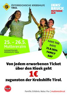 Am 25. und 26. Mai 2024 ist es soweit: Die Muttereralmbahn startet in die Saison mit einem Knall, einer Prise Nächstenliebe und einem Ausblick auf ein weiteres Highlight. Für jedes über unseren Kiosk erworbene Ticket spenden wir 1€ an die Tiroler Krebshilfe – weil wir nicht nur Berge versetzen, sondern auch Herzen erwärmen wollen.Von jedem erworbenen Ticket über den Kiosk geht 1€ an die Krebshilfe Tirol.