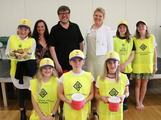 Krebshilfe Geschäftsführer Stephan Spiegel bedankt sich bei Direktorin Annemarie Seethaler und Elisabeth Stritzl, der Organisatorin des Charity-Events, für die Unterstützung. Im Bild auch die jungen Schauspielerinnen Antonia Aschauer, Melanie Schmidt, Lilli Kofler (hinten, v.l.), Sarah Mitterer, Katharina Hasenschwandtner und Nina Krichhammer (vorne, v.l.). Foto: Wolfgang Stritzl